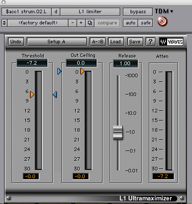 “If you were to listen to the acoustic guitar without the plug–in, it would sound kind of lazy and not urgent. It doesn’t sound exciting or like it’s really digging in. Instead I wanted to give the guitar an immediate attacking, in–your–face sound, as if it’s really digging in and played with fingernails as opposed to the skin of the finger. That’s what the plug–in provided. The brain subconsciously analyses where the front of the note is and what the feel of a record is. If you have attack like this, the recording feels exciting and vibrant, like it’s moving and is fast. It’s a large part of the way the record feels. I had the same TransX Wide setting on the acoustic guitars throughout the song, it’s actually a preset that I like — and a setting that I use on various songs. The little red dot shows you that the level is overloaded at 11, so I pushed that plug–in really hard.