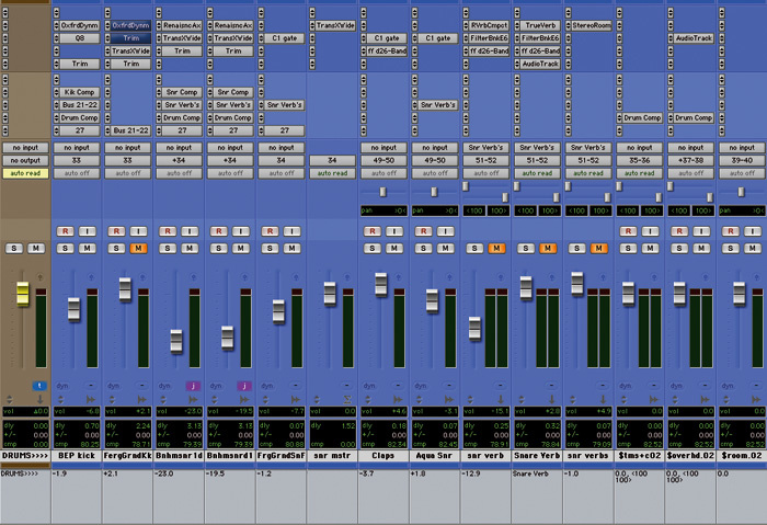 JJ Puig’s choice of drum processing was hugely complex, as you can see from the Pro Tools Mix window. Again, Waves’ TransX was an important tool in shaping the sound.