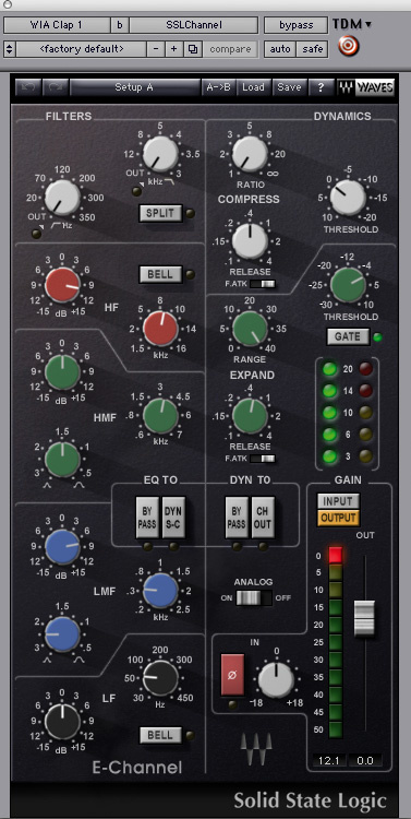 “The other plug–in on the acoustic guitar is the L1 Ultramaximizer, which just helped me to put the guitar further in your face after it received the treatment I just described. You can see I put the output all the way up to zero. There’s nothing better than an L1 to put things in your face; it will always be the Granddaddy of Waves. So first of all I got the feel of the acoustic guitar right, then I made sure it was very prominent and in your face. The remainder of the guitars are some strumming guitars on the left, nothing significant, and there are couple of electric guitars, which you can see on the right. They were a little bit clean, and I wanted them to have some more personality, so I ran them through the Stomp 2 [part of Waves Guitar Tool Rack], and I also used [Line 6’s] Echo Farm. The Stomp 2 adds tremolo and vibrato to create a bit of movement in the guitar, and the Echo Farm is set to a delay for a little bit of an ambient feel. As far as outboard on the guitars is concerned, I would have inserted a pair of Gates Level Devil compressors on the board. They are old tube compressors, and they give a big fat sound.”