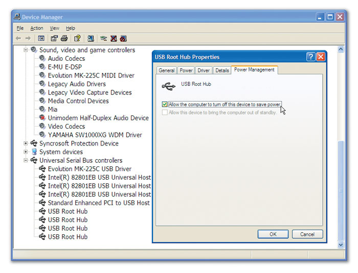 Occasionally, intermittent USB device problems can be tracked down to Power Management issues. Windows is normally allowed to turn off devices to save power if no activity has been detected for some time, but you can disable this feature to ensure steady power delivery to selected devices, especially if you know that they either have minimal power requirements or their own dedicated PSU. Open Device Manager, and for each of the USB Root Hubs that are being used to connect audio/MIDI devices, un-tick the box labelled 'Allow the computer to turn off this device to save power'.