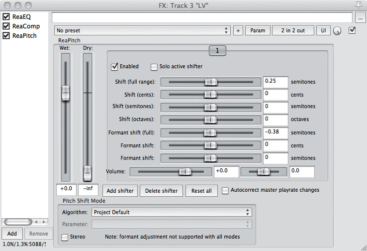 ReaPitch also boasts an Add Shifter button which allows you to add multiple 'shifters' in one instance of the plug-in. This is used to produce additional layers of pitch processing, each of which can have different parameter settings, including panning. This is useful for thickening effects or for creating simple harmonies. The balance between these shifters can easily be modified too, simply by adjusting their 'wet signal' faders.