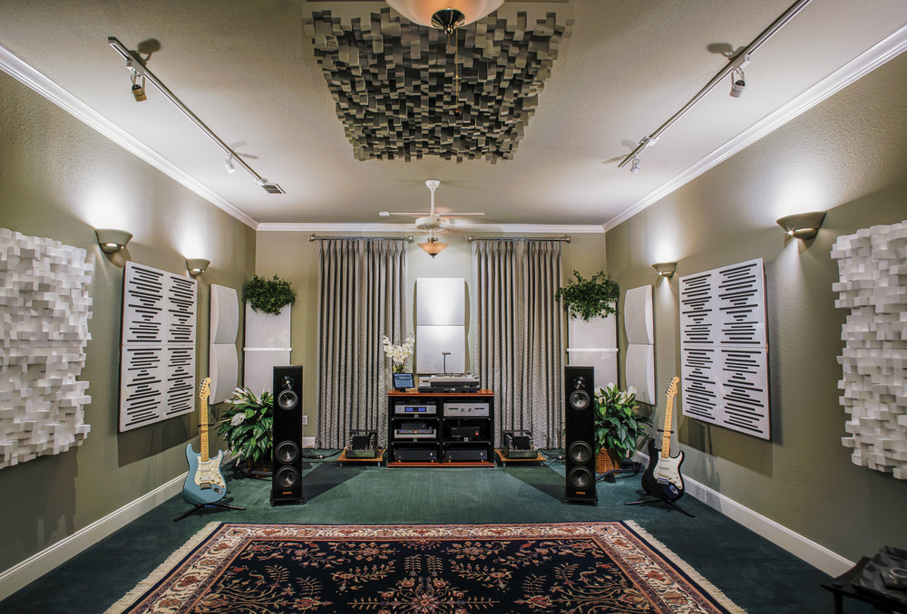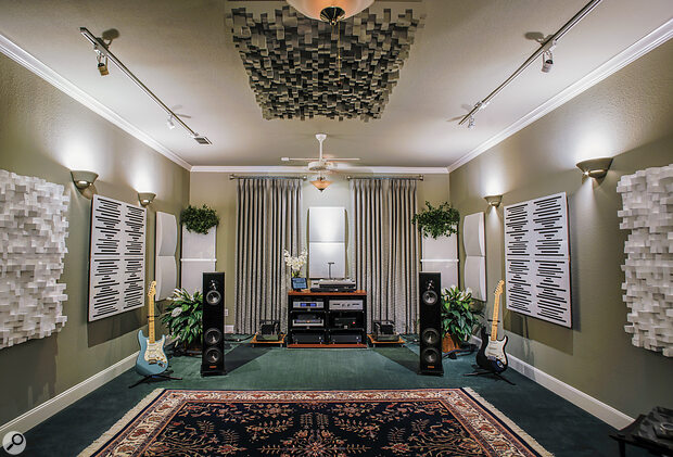 The Vicoustic Multifuser DC2 panels (the white panels to the extreme edges of the photo) are made from high-quality expanded polystyrene, and provide effective diffusion, or scattering, of wall reflections, allowing a room to remain bright-sounding while eliminating deleterious flutter echoes.