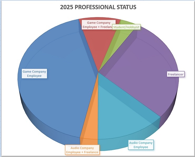 A total of 654 people responded to the survey — one of the most referenced of its kind in the video-game industry — the vast majority of them being game audio professionals such as composers, sound designers and middleware and audio programmers for AAA, Midcore and Indie games.