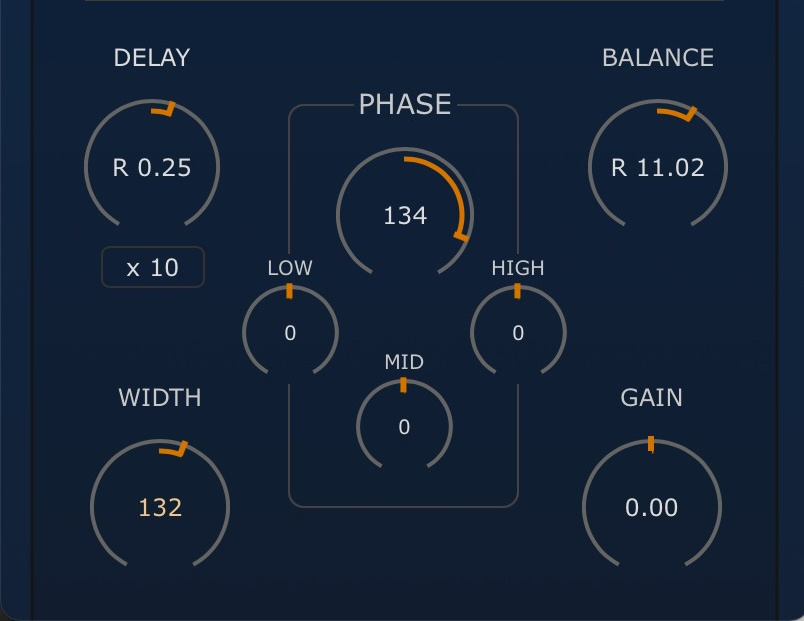 A built-in goniometer offers a visual overview of the signal’s stereo information, while levels can be monitored using the plug-in’s peak meter. A set of buttons offer some useful functions such as polarity inversion (individual left/right and absolute options are provided), left/right swap and mono summing, with more in-depth adjustment provided by variable Delay, Balance, Width, Gain and Phase controls — the latter offers separate adjustment of phase across low, mid and high frequency bands.