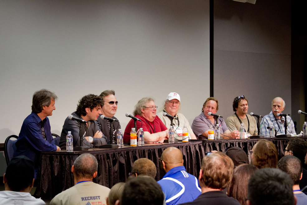 The Producers’ Panel featured (L-R) Bob Clearmountain, Fab Dupont, Ross Hogarth, Mick Guzauski, Bil Vorndick, Ed Cherney, Richard Chycki, and Bruce Swedien.The marquee event at GearFest '14 was Saturday's Producer's Panel, featuring an unprecedented gathering of producer/engineers, including Bruce Swedien (Michael Jackson, Paul McCartney, Count Basie), Bob Clearmountain (The Rolling Stones, David Bowie, Bruce Springsteen), Ed Cherney (Eric Clapton, Bonnie Raitt, The Fabulous Thunderbirds), Mick Guzauski (Daft Punk, Earth, Wind & Fire, Mariah Carey), Ross Hogarth (Van Halen, Motley Crue, REM), Richard Chycki (Aerosmith, Rush, Dream Theater), Bil Vorndick (Bob Dylan, Alison Krauss, Bela Fleck), and Fab Dupont (Queen Latifah, Jennifer Lopez, Bon Jovi). The panel held a lively discussion on a range of music recording and production topics moderated by Sweetwater's Editorial Director and noted author/journalist, Mitch Gallagher.