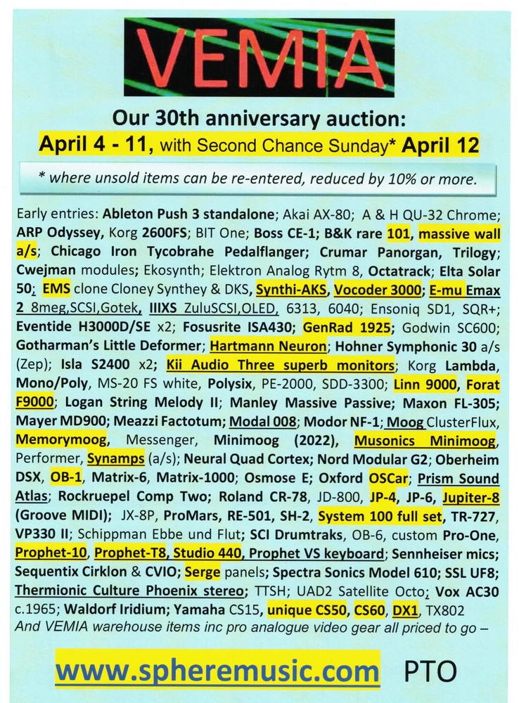 VEMIA’s latest gear auction is just around the corner, and there’s already a wealth of sought-after instruments and studio gear listed. The auction will be taking place between 4 and 11 April 2026, and all unsold items will be re-listed with at least a 10% reduction as part of a Second Chance Sunday sale scheduled for 12 April.