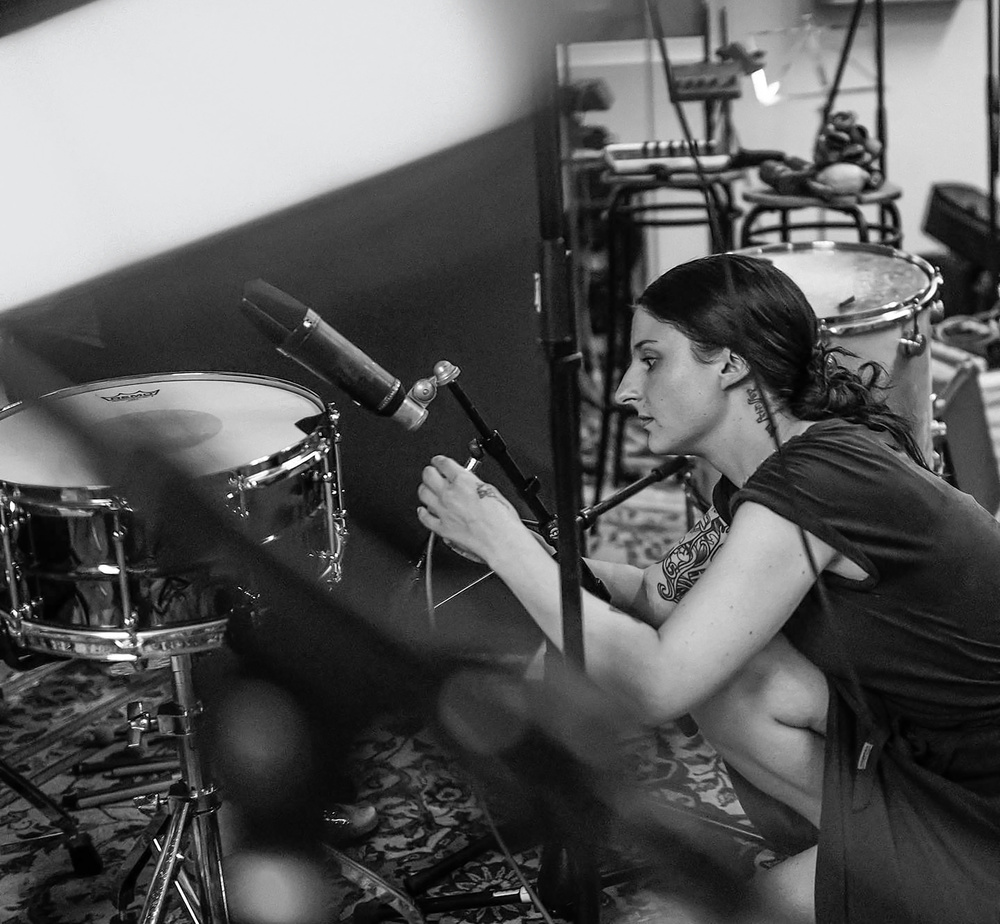 Fine‑tuning drum mic placement at Soundfarm.Photo: Frost & Fog