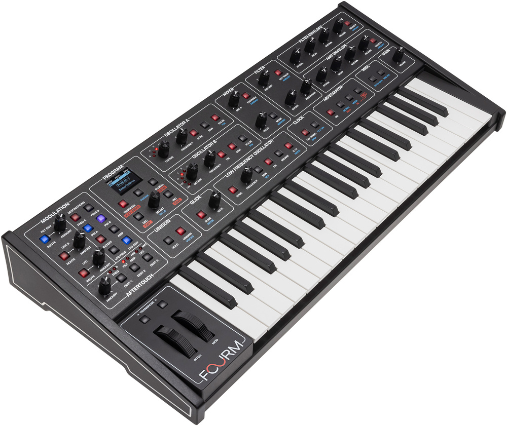 At first glance, Sequential’s latest synthesizer offers nothing new. The Fourm is a two‑oscillator, four‑voice analogue synth with mini‑keys. Big deal. But this little powerhouse turns out to be all sweet spot, with a sumptuous vintage sound at a reasonable price. It’s a masterclass in miniaturising, somehow managing to retain a big synth analogue sound and user experience. Think of it as a monosynth with four voices, surprisingly playable polyphonic aftertouch, a one‑knob‑per‑function front panel and plenty of thoughtful modernisations. It also proves that Sequential is in great hands under the stewardship of Focusrite. Rory Dow
