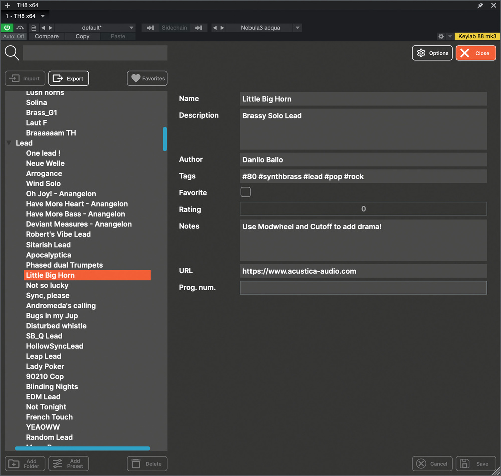 To give some additional context, during testing I made some extensive side‑by‑side comparisons with Arturia’s Jup‑8 V4. The two soft synths occupy the same sonic territory, as you’d hope, but for similar settings the Acustica synth always produced more high‑frequency content. Both emulations include original Jupiter‑8 presets like ‘Negative Pluck’, and when comparing those TH8 still has considerably more presence and sparkle, with a character that is not matched by opening the Jup‑8 filter (or switching to 12dB/oct mode, for 24dB/oct sounds). This is not to say that Jup‑8 V4 is bad. Far from it: it’s also a great‑sounding virtual synth that offers some more possibilities around unison mode than TH8, and has valuable additional modulation sources and effects processors. But TH8 more often made me think ‘Oh I see!’ in a way that was normally reserved for the increasingly rare occasions I’ve met a hardware Jupiter‑8 (or Prophet‑5, or Minimoog...) in a studio. In that respect it deserves some serious kudos as an emulation: it’s probably the finest virtual Jupiter‑8 out there, currently.