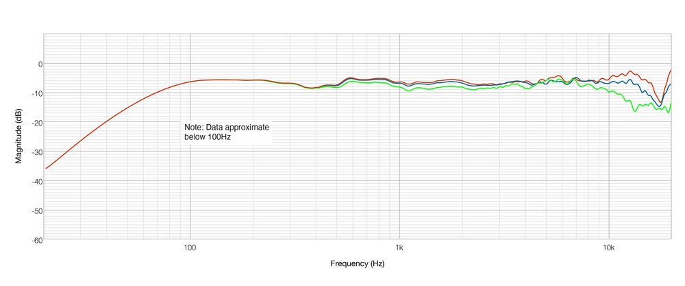 Diagram 3: Axial response (red) versus +15 and ‑15 degrees vertically off‑axis (green and blue traces, respectively).