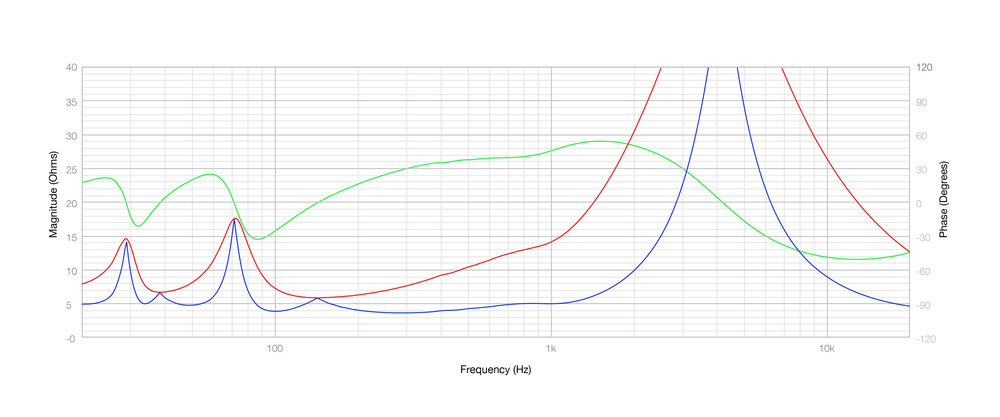 Diagram 4: The One18X’s input impedance. Red = magnitude; green = phase; blue = EDPR.