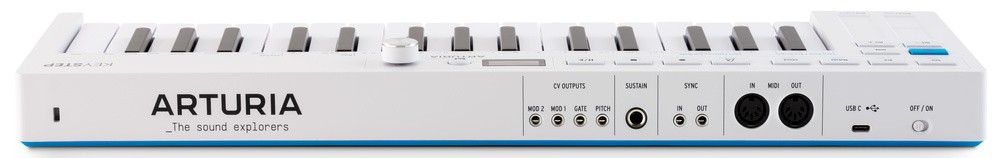 At the back, we have a USB‑C port for power and connection next to a very welcome on/off switch, although we have lost the option for DC power. We then have full‑size MIDI in and out ports, 3.5mm sync in and out, a quarter‑inch sustain port and a bunch of 3.5mm CV outputs. We get an additional CV mod output to add to the original pitch, gate and mod jacks. Something I’ve always found curious about the KeyStep range is that Arturia talk about the compact depth enabling you to be closer to the thing you’re controlling, except you have all these ports getting in the way as their cables spew out the back. I would have liked to have seen these ports running along the front panel, or pushed to the sides to enable you to butt the KeyStep up against its hardware destination. I would also like to have seen the labels of the ports printed on the front panel, as they do with the KeyStep Pro, to save me writing them on with a Sharpie so that I don’t have to turn the keyboard on its edge every time I want to patch it in.