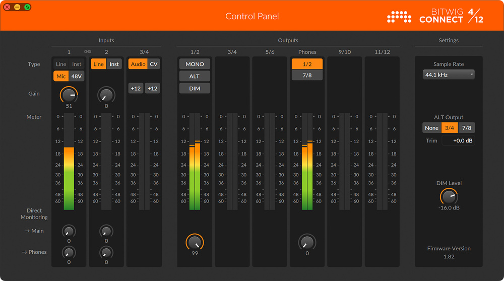 This is probably about as far as you’ll get without reading a manual, and since my unit arrived without one, I had to do a bit of hunting around on the Bitwig site to find one, at which point I discovered that there’s also a dedicated control panel application for setup and mixing on‑screen. If you’ve already gone ahead and connected the device to a computer and fired up your DAW of choice, you’ll notice that it actually claims to have six inputs, not four. Inputs 5 and 6 are a dedicated loopback connection from the (pre‑fader) main outputs, useful for capturing live mixes or non‑DAW computer audio.