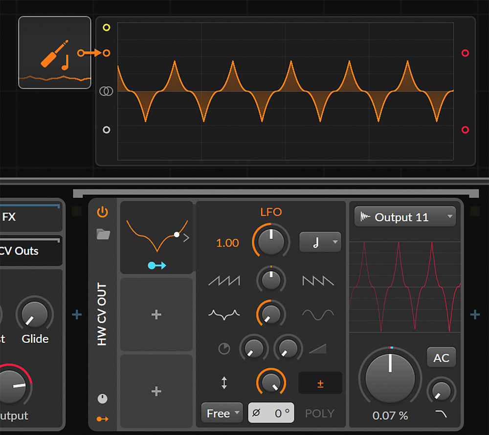 The most direct way to hook up a modular is by using the HW CV Instrument device, a Bitwig instrument which takes in MIDI, converts it to CV/gate, sends that to the hardware and takes in the resulting audio. You select the two interface ports for CV and gate output, and the input port (or port pair for stereo) for audio coming back. All of Bitwig’s CV I/O endpoints detect when a Connect interface is attached, and rely on its internal 1V/octave calibration. The HW CV device also has an embedded device chain purely for hosting additional CV outputs: these are fixed, although you can alter them with modulators, automate them and so on. In the screenshot, I’ve demonstrated by modulating a CV out with a Bitwig LFO, physically patching it up as a loopback on the Connect itself, and have an oscilloscope display of the result coming in.