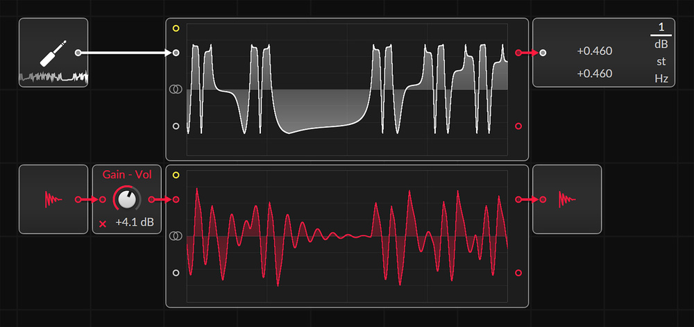 As with my loopback experiment, the Grid’s oscilloscope comes in useful here to see what’s going on. Each of the 3.5mm jacks has its own multi‑colour LED, which tracks the colour of the Grid module’s input or output on screen (though the colour indication was not totally reliable for me). Multiple signals to the same output are summed.
