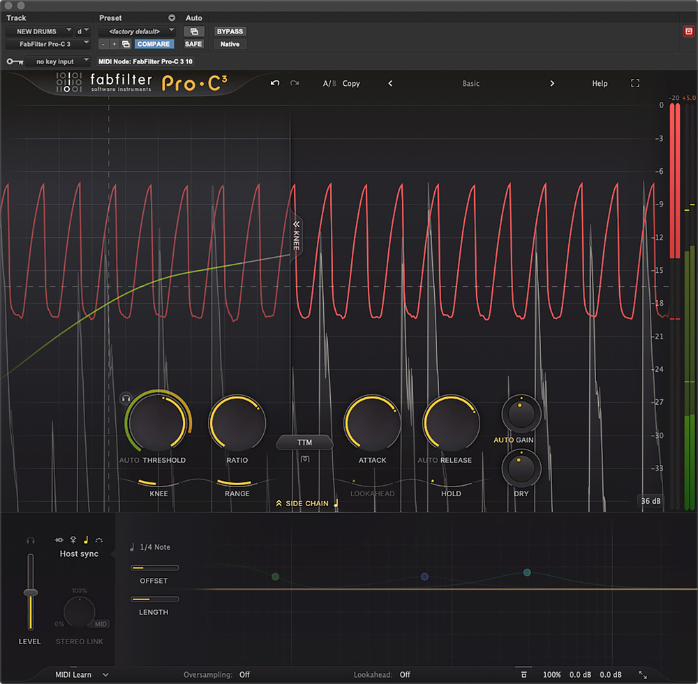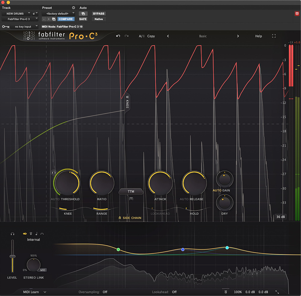 Something that has always been a strength of FabFilter, and of Pro‑C in particular, is preset design. Many old‑school engineers pour scorn on the idea of compressor presets, saying — correctly enough — that settings need to be tailored to the individual source. But FabFilter’s developers have found a way to generate banks of presets that are genuinely adaptable and useful. In most cases, an intended gain reduction range is specified, so you load the preset and tweak the threshold until you see the right amount of attenuation on peaks. And then you can inspect the settings to find out how they’ve achieved the particular sound in question. As well as being genuinely useful in their own right, the presets are a great introduction to less familiar features such as TTM mode.