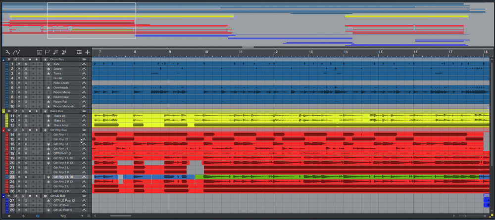 One brand spanking new feature, or to put it another way, a catch‑up feature that almost every other DAW has, is the Overview. It has a button on the top toolbar that drops down a session overview squished into an inch‑high band that runs all the way across the top of your screen. Your current arrangement view is seen as a little grey box outline. You can click and move this about for super‑fast project navigation. It works, it’s good, and I’m glad to have it aboard.