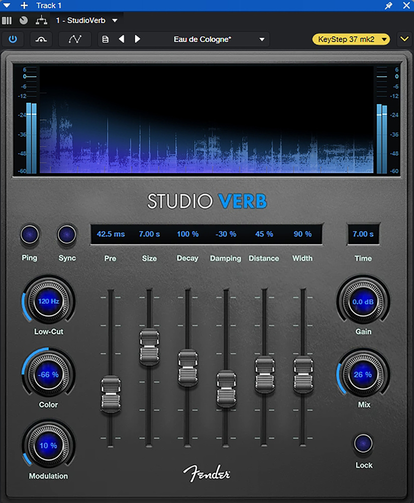 The other plug‑in Fender snuck onto the list is Studio Verb. It’s an algorithmic reverb inspired by the classic Lexicon 224 digital reverb, and it provides all the familiar parameter sliders and a spectral display. There’s no option to change the algorithm, so you craft your reverb from the front panel. It’s a nice addition to the three other reverbs already present, but its lack of visual conformity makes it look a little bit out of place.