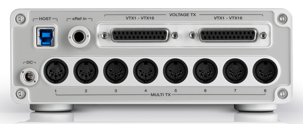 Let’s look at the physicals first. The GridLock II is a desktop USB 3 MIDI interface with ports on the front and back. It can also be rackmounted using a custom 19‑inch rackmounting kit. It’s a fairly chunky unit measuring 190 x 235 x 70mm. On the rear are eight 5‑pin DIN ports. These can carry any MIDI or DIN‑Sync data, switchable per port. There is also a pair of DB25 connectors for the optional VTX‑1 Eurorack CV breakout box, which provides 16 CV outputs. Innerclock tell me that additional breakout box formats are coming.