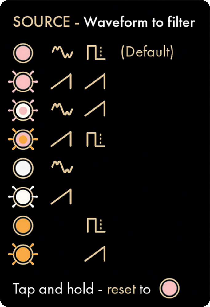 The Seashell’s eight source combinations are accessed on the hardware by stepping through the Source button, or via the control app or plug‑in.The wavefolder can be hand cranked from a slider, or modulated by the envelope or the CV input that’s shared with the filter. There’s also an attenuator that sums in whatever is present at osc 1’s FM input, which is osc 2 unless you’ve patched something. This ‘analogue symmetry’ control is effectively an animated bias that changes the folding character.