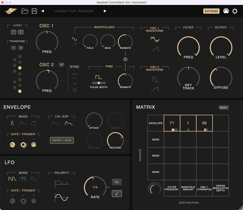 As a synth the Seashell combines a ‘bottom‑up’ block that defaults to a sine wave passing into a wavefolder, with a harmonic oscillator (saw/pulse/triangle) that can run at audio or LFO rates. Similar to the Buchla Easel’s complex and modulation oscillator pairing, but with the addition of a filter like Majella’s Implexus.