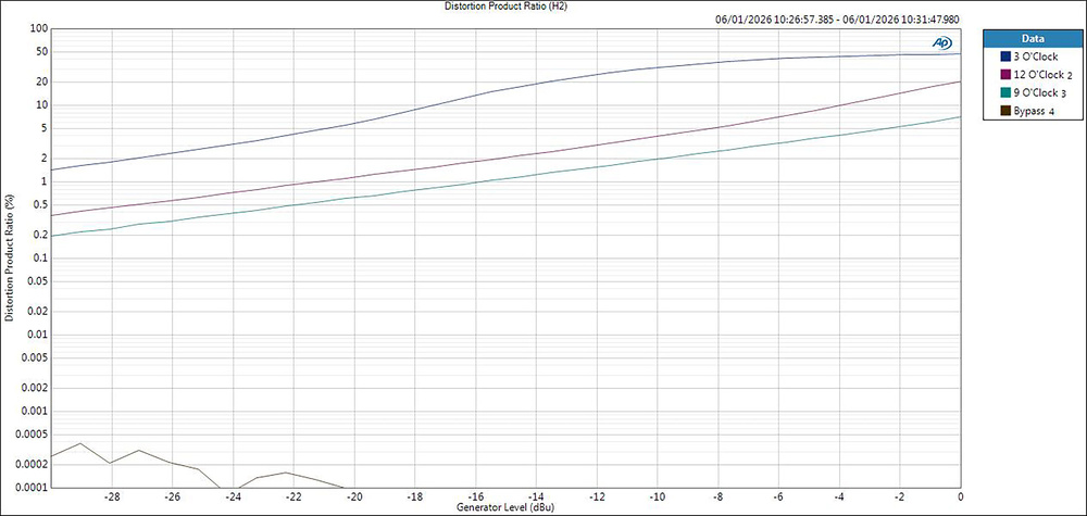 This Audio Precision measurement shows the Tall & Fat’s second harmonic distortion ratios for three different drive settings as the input signal level rises from ‑30dBu to 0dBu — a fairly typical working range for a clone‑wheel organ. The harmonic distortion in bypass mode is shown by the bottom trace which is below 0.0005%.