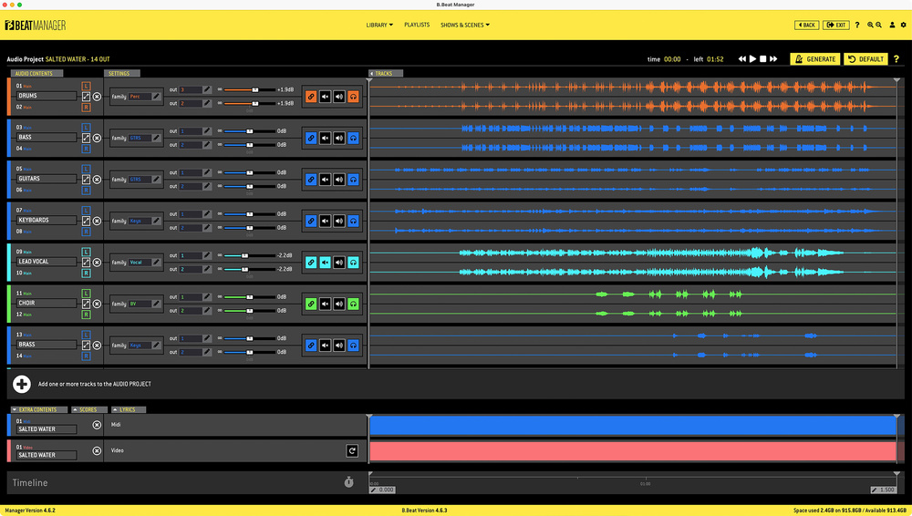 Imported projects displayed in the B.Beat Manager library show audio waveforms, output routing and family groups, along with any associated video, PDF and MIDI files.