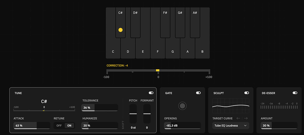 When the Correction section is selected, a set of seven mini panels is displayed along the bottom of the plug‑in. The signal chain, running from left to right, consists of Tune, Gate, Sculpt, De‑Esser, EQ, Compressor and Saturation. As far as I can tell, this order is fixed, but it has been arranged logically and, in use, it didn’t ever feel constraining.