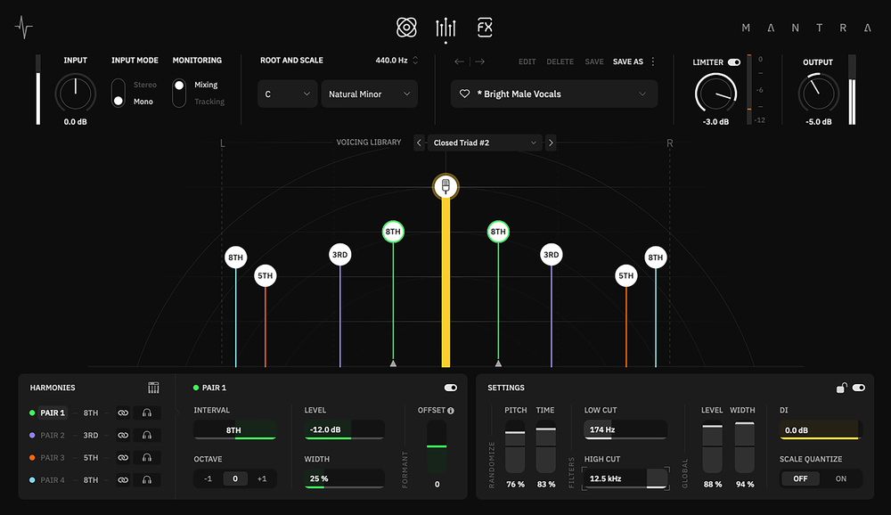 Controls for the individual voices/pairs are in the lower‑left panel, while the lower‑right panel provides global controls for all the harmonies. These allow you to humanise the pitch and timing, apply high‑ or low‑cut EQ, offset the formants and adjust the overall balance relative to the input voice. You also get the option to turn off Scale Quantize, which I felt produced a more natural result.