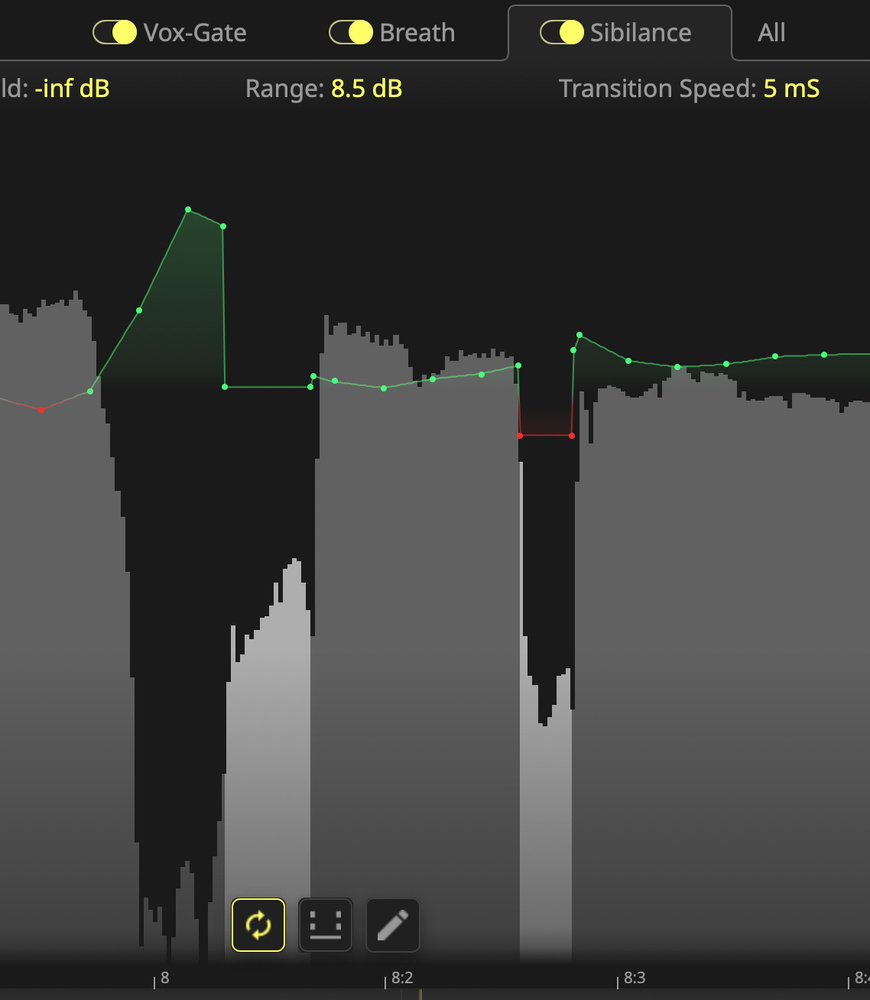 Though it was effective, I found the visual feedback of the de‑essing tab a little more confusing. While the detected esses are highlighted, esses are briefer than breaths, and depending on your zoom settings they can be harder to see. Also, it’s not always immediately obvious what the de‑ess contribution is to the overall automation — it’s possible to have the audio being turned up for other reasons, so that even when de‑essing the net effect is indicated in green (for gain) on the automation curve. I’d quite like the option of dedicated lines to indicate the de‑essing and de‑breathing gain reduction — and again, when I put that to Noiseworks, they said I was not the first to suggest that, and it’s in their plans. The audible results are good, by the way.