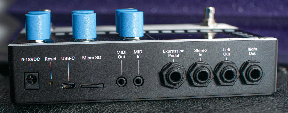 The top panel features with an array of large rotary knobs (some of which also operate as push buttons), a very nice display that provides plenty of graphical feedback in use, two rows of smaller buttons (with colour‑coded lighting used to identify different functions or operating modes) that are used when sequencing patterns, and three high‑quality footswitches. As shown in the images, the back panel features an impressive array of audio, MIDI and USB connectivity, alongside a microSD card slot (used, for example, for firmware updates) and a 9V power jack designed for use with standard pedalboard power supplies.