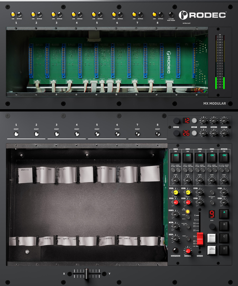 The MX Modular is a culmination of many of Rodec’s previous specialisms. It’s a mixer, of course, but it feels distinctly different from any mixer you might have encountered. It’s aimed at the traditional mixer market, but also at the audio interface and DJ markets. You can customise the number of mono or stereo channels (any combination of eight mono or four stereo). It incorporates a 10‑slot 500‑series rack that allows for personalisation of the first eight channels, as well as the master channel. It’s also an 18 I/O, class‑compliant USB audio interface capable of sample rates up to 192kHz. There’s even an assignable crossfader — something that might at first appear to be a playful nod to Rodec’s club heritage but which, it turns out, is genuinely useful in the studio and on stage.