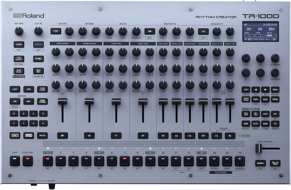 The TR‑1000 expands both physically and functionally on Roland’s primary general‑purpose drum machine of recent years: the TR‑8S. It adds analogue drum voices to the digitally synthesized and sample‑based sources, new features like sample slicing and bpm matching, and a much improved user interface.