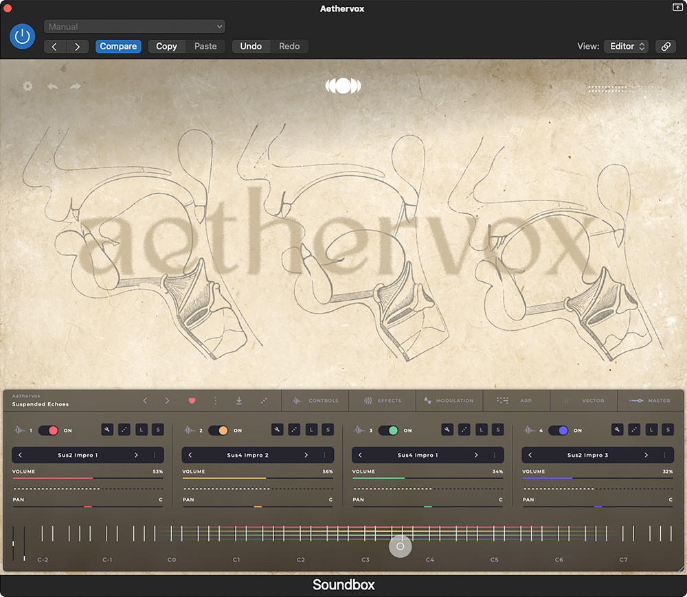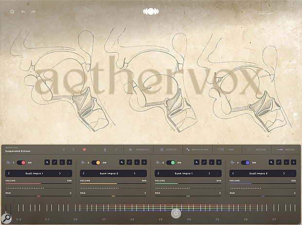 There are a couple of free sound packs that are worth exploring, but the focus of this review is the new Sonora Cinematic Aethervox, a pack that provides, as the name suggests, vocals of an ethereal nature. Sonora Cinematic have produced some wonderful vocal sound libraries and while Aethervox may only comprise 15 presets, up to four presets may be combined to create vocal textures that shift and evolve in a very emotive way. Apparently Aethervox’s source sounds are in the spirit of Sonora Cinematic’s respected Aria Vocalscapes and Emma Legato Kontakt libraries (I can’t say whether the samples used here have been taken from those libraries or not), and then formatted to produce this set of cinematic‑style vocal textures designed specifically to run in Soundbox. The whole library occupies only 350MB of drive space too.