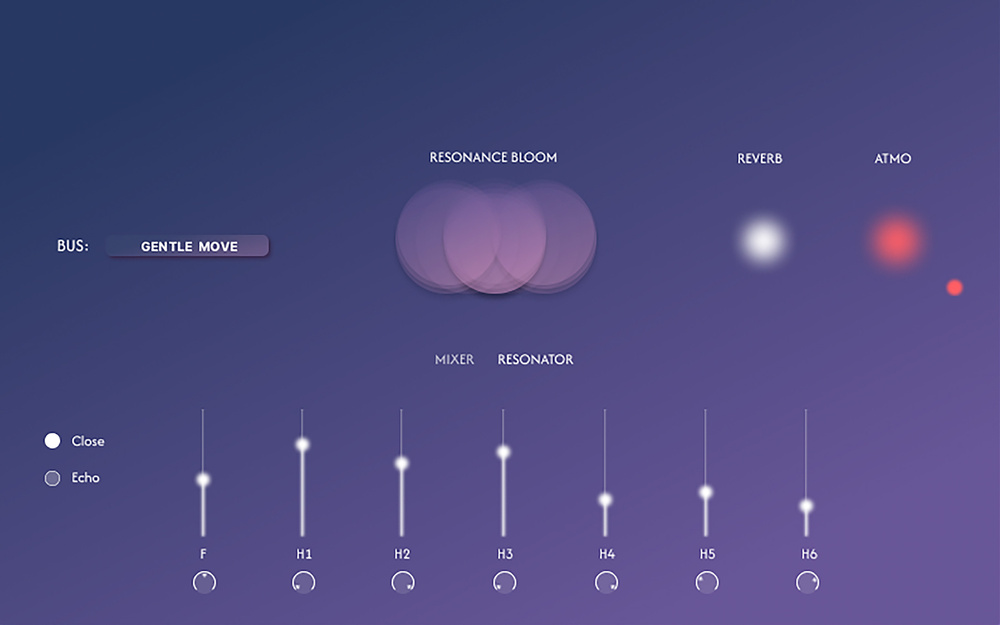 As with Harmonic Bloom, Refraction’s UI features sliders that control a series of resonant band‑pass filters — there are seven in all comprising the fundamental and harmonics one through to six. Clicking on the words Mixer or Resonator switches the fader view accordingly. The strength of the resonators can be controlled from the GUI or via a mod wheel (or reassigned to another controller) but the key point is that the resonators are independent of the Mixer level settings so you could opt to turn down all the mic faders and just play the resonators — which produces a wonderfully ethereal pad sound. The user can define a starting point for the harmonics by adjusting the individual sliders in the resonator view, after which the mod wheel (or GUI knob) will modulate this setting both in volume and the resonance of each band. Depending on how the harmonics are balanced the sound can go from a soft pad to a glassy timbre. The resonators feed from the tails of held notes and can be selected to be driven from either the Close‑mic submix or the Echo signal.