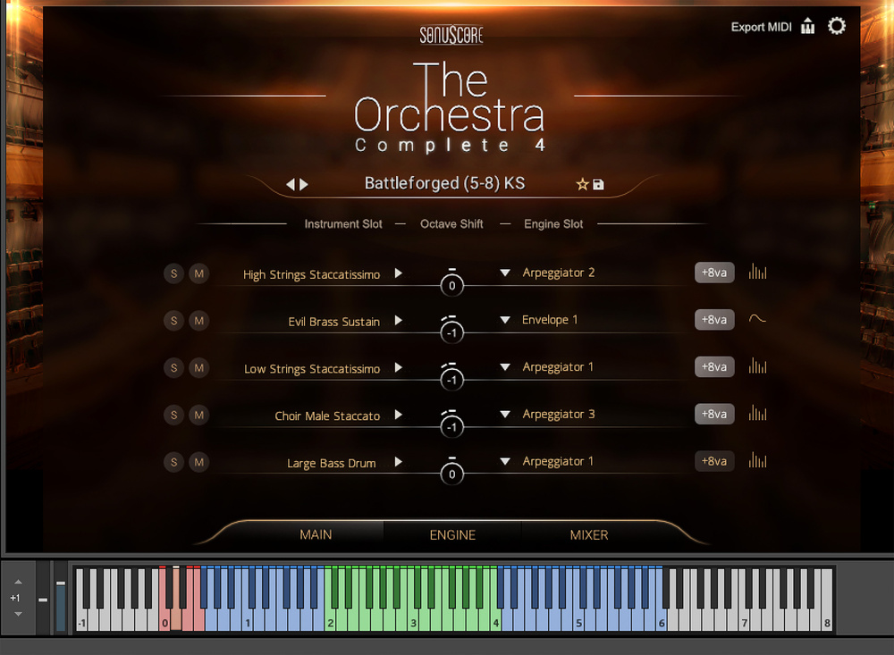 The playable range for each preset/instrument is marked in blue on the keyboard. Animated Orchestra presets, “optimised to sound best in the two octaves around middle C”, according to Sonuscore, are marked in green.