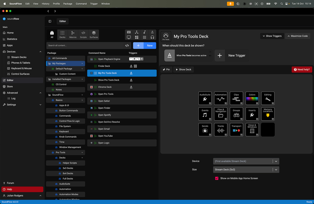 For deeper tasks like creating your own commands, writing scripts and editing decks and Surfaces, the full SoundFlow application and editor remain available. Pro Tools 2025.10 installs these components in the background along with the bundled content. From the menu bar you can launch the SoundFlow editor to undertake customisation, scripting or complex controller builds. Custom control layouts called Surfaces are available to power users, though casual users will never need to create them.