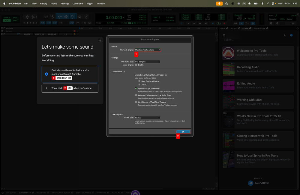 As described in the main text, the Session Assistant Flow can be instructive for new users because it doesn’t just perform tasks, it shows you how they’re done. That concept has also been developed in SoundFlow 6 and Pro Tools 2025.10 to deliver an entirely new style of tutorial system. Traditional linear video walkthroughs remain part of the package, and in some cases, a one‑way video demonstration is exactly what’s needed. But video training can only ever show one example, at one pace, with one outcome.