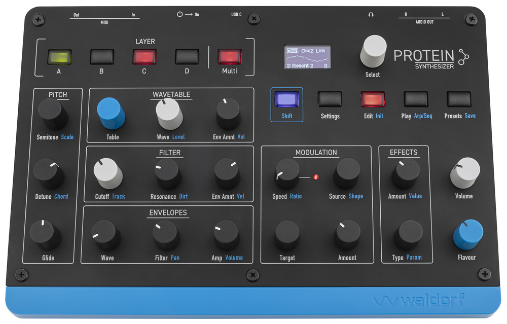 Waldorf Music have been synonymous with wavetable synthesis since the late 1980s. The Microwave, released in 1989 and derived from the PPG Wave, launched a long series of wavetable‑based instruments. Over the decades, they’ve refined this formula across numerous products, from the Wave and Blofeld to the modern flagships, the Quantum and Iridium. The Protein takes the essence of Waldorf’s wavetable history and distils it into a small, affordable synthesizer that can still produce those classic crunchy digital sounds.