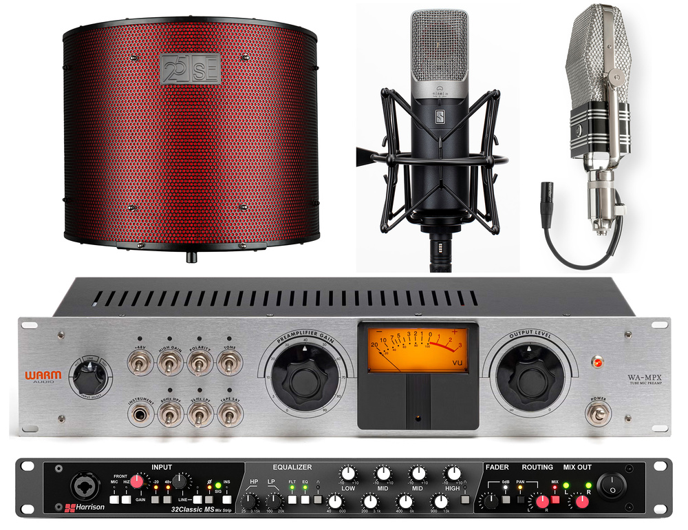 Clockwise from top left: sE Electronics Reflexion Filter Pro, Slate Digital ML-1A, Warm Audio WA-44, Warm Audio WA-MPX, Harrison 32Classic Mix Strip.