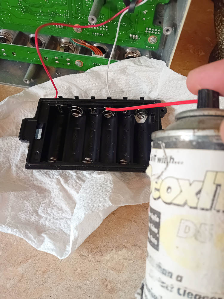 When done, rinse and dry the area (I use kitchen towel for this). Then you just need to make sure the battery contacts are clean enough to make a good contact. Again, you can just give these a good scrape or rub with something abrasive and blow away any dust, and then, for good measure, give them a squirt of contact cleaner such as DeOxit D5 or Kontakt Super 10. That should be job done: stick some new batteries in there and give your gear a try. If that hasn’t done the trick, it’s time to let go, buy a replacement, or if the gear’s rare or valuable maybe contact an electronics repair specialist.
