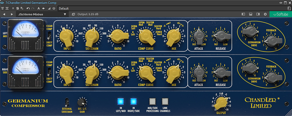 Softube’s Chandler Germanium Compressor plug‑in is a key element of the author’s mix bus chain, again with fixed settings.
