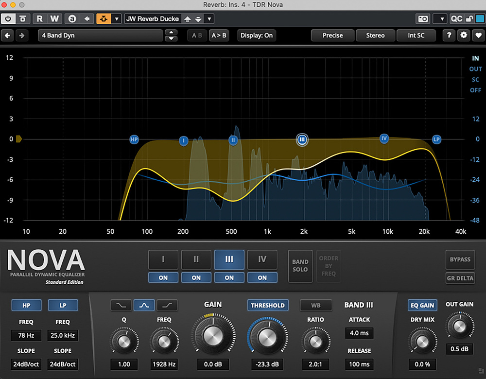 It’s not quite as sophisticated a solution as that found in Aurora, but it’s interesting to try and lets you focus your automated reverb (or delay) ducking (or ‘unmasking’ if you prefer that terminology) on the frequency range within which your vocal is sitting at any given instant. Of course, Frequency 2 is only available to Cubase Pro users, but you can use the same approach with any dynamic EQ plug‑in that supports external side‑chaining. If you don’t currently own such a plug‑in, you could always download a suitable free option, and top of my personal list would be Tokyo Dawn Labs’ NOVA. This free download supports all the major plug‑in formats and provides a four‑band dynamic EQ with side‑chain support and additional low‑/high‑pass filters. The final screenshot shows a configuration that might be used to match what I set up for Frequency 2, and it responds equally well to a side‑chain input in Cubase Elements, Artist and Pro.