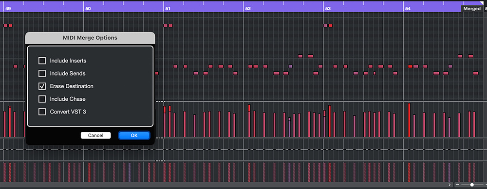 First, duplicate the required MIDI/virtual instrument track (the ‘sensible’ bit; you can always go back to the original if required) and then solo that track. Second, place the left/right locators around the copies of the MIDI loop where you want to lock in the Velocity Variance and Play Probability settings. Third, from the MIDI menu, select Merge MIDI In Loop, and in the dialogue box that appears make sure to tick the Erase Destination button. When you then click OK, a single new MIDI clip replaces all of the MIDI loop clips.
