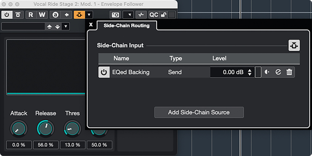 For the second stage of the process, this instance of the Envelope Follower uses its side‑chain input to let it track the volume of key elements in the backing track.