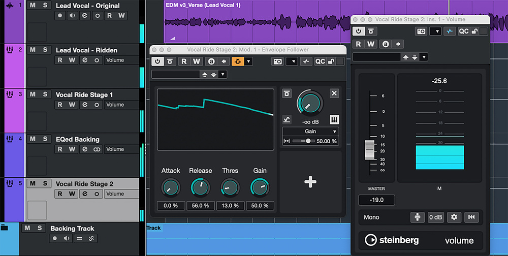 In the first stage of our DIY vocal riding, the combination of the Envelope Follower Modulator and Volume plug‑in lets us reduce the dynamic range of the original vocal.
