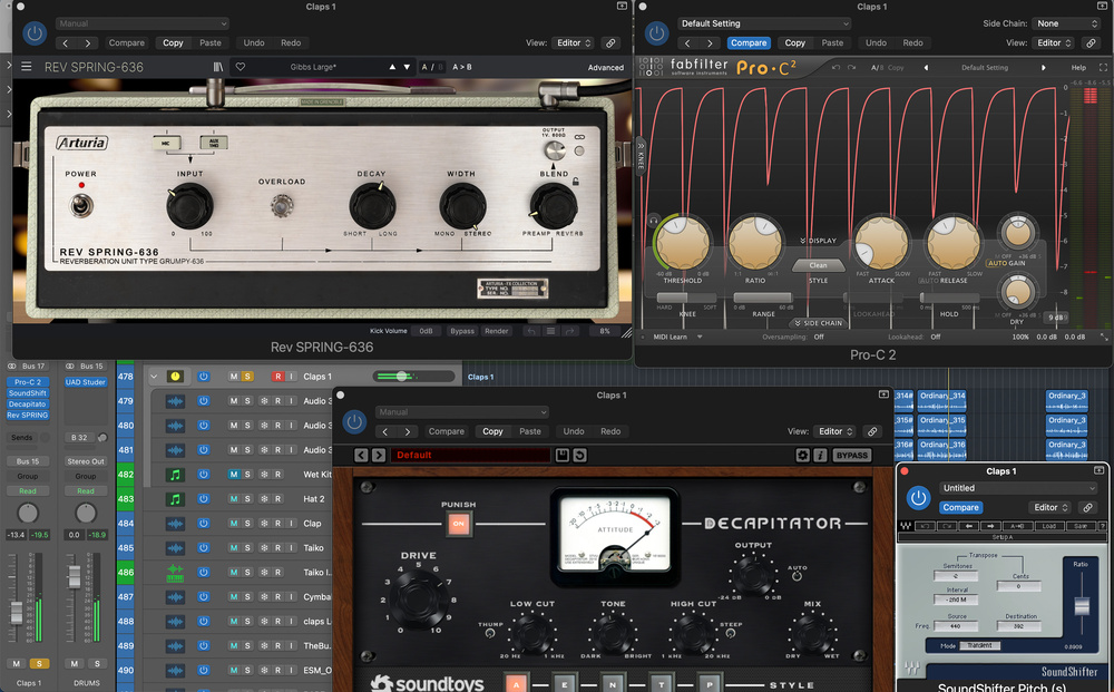 “There’s not a lot going on in the drums and percussion. Just the kick, the claps recorded in my living room, some toms, and the timpani. The quarter‑note claps do what a hi‑hat would normally do. I put the Arturia Rev Spring 636 spring reverb on them for a little bit of a vintage vibe. It rolls off some of the highs and gives it a nice texture. I again used SoundShifter, to pitch the claps two semitones down, in this case just to darken the sound and give them a different feeling. Finally, there’s the Decapitator again, which is a classic go‑to for me. I’m doing pretty heavy saturation as well as compression, to level everything out. On the drum bus I had the UAD Studer 800. I find it reduces some of the width sometimes, but it does something to glue together the drums in this song. And it’s just adding a little bit of saturation and grit, makes the drums cut through in a more aggressive way.”