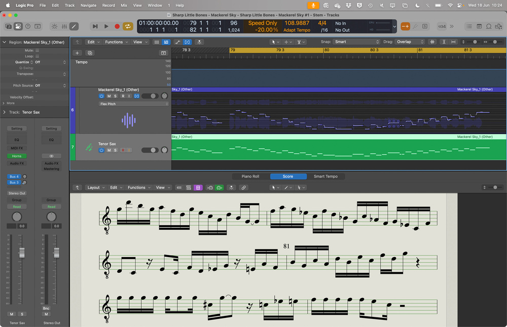 Let’s say you want to transcribe a saxophone part. Start by clicking the Show/Hide Flex button (or press Command+F), then select Flex Pitch from the Flex Mode pop‑up in the track header. Logic will analyse the audio, detect transients, and assign MIDI notes accordingly. To view and edit this data, press E to open the Track Editor, then head to Track Editor / Edit / Create MIDI Track from Flex Pitch Data. Press N to open the Score Editor, and you can now view this part in standard notation. Head to the Style pop‑up menu at the top of the inspector to change to a lead sheet or to transpose for Eb or Bb instruments. Whilst you’re there, you can also apply visual quantisation to further help refine the score.