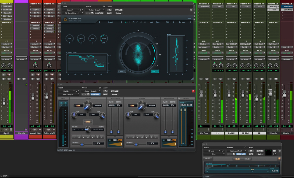 Pan controls only allow the stereo image to be narrowed. If you want to widen the top end, as so often is desired, you can use your usual Mid‑Sides techniques on the high band. An alternative way of achieving this is to duplicate the top band and insert Mod Delay on the copy. Set delay to a 100‑percent wet, short (under 30ms) single repeat (no feedback). Follow this with a Multi‑Mono Trim plug‑in with the master Link button unlinked and one of the two channels polarity inverted. This introduces a slightly delayed, out‑of‑phase version of the top band, which adds width — very neat!