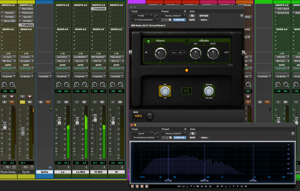 I’ve never been much of a fan of chorus as I find it can easily make things sound too unstable, but if the effect is applied only to the overtones of a pitched sound, leaving the fundamental unaffected, then the rather queasy feeling which can result from too much chorus can be easily avoided. This is an ideal candidate for the multiband treatment. A single band of chorus on the most appropriate area might be all you need, but if you want to experiment with multiple choruses with individually tweaked settings for each band, you absolutely can.